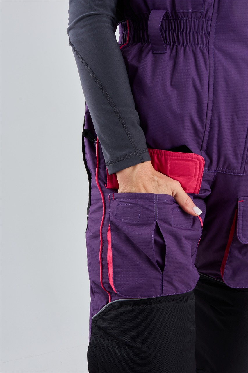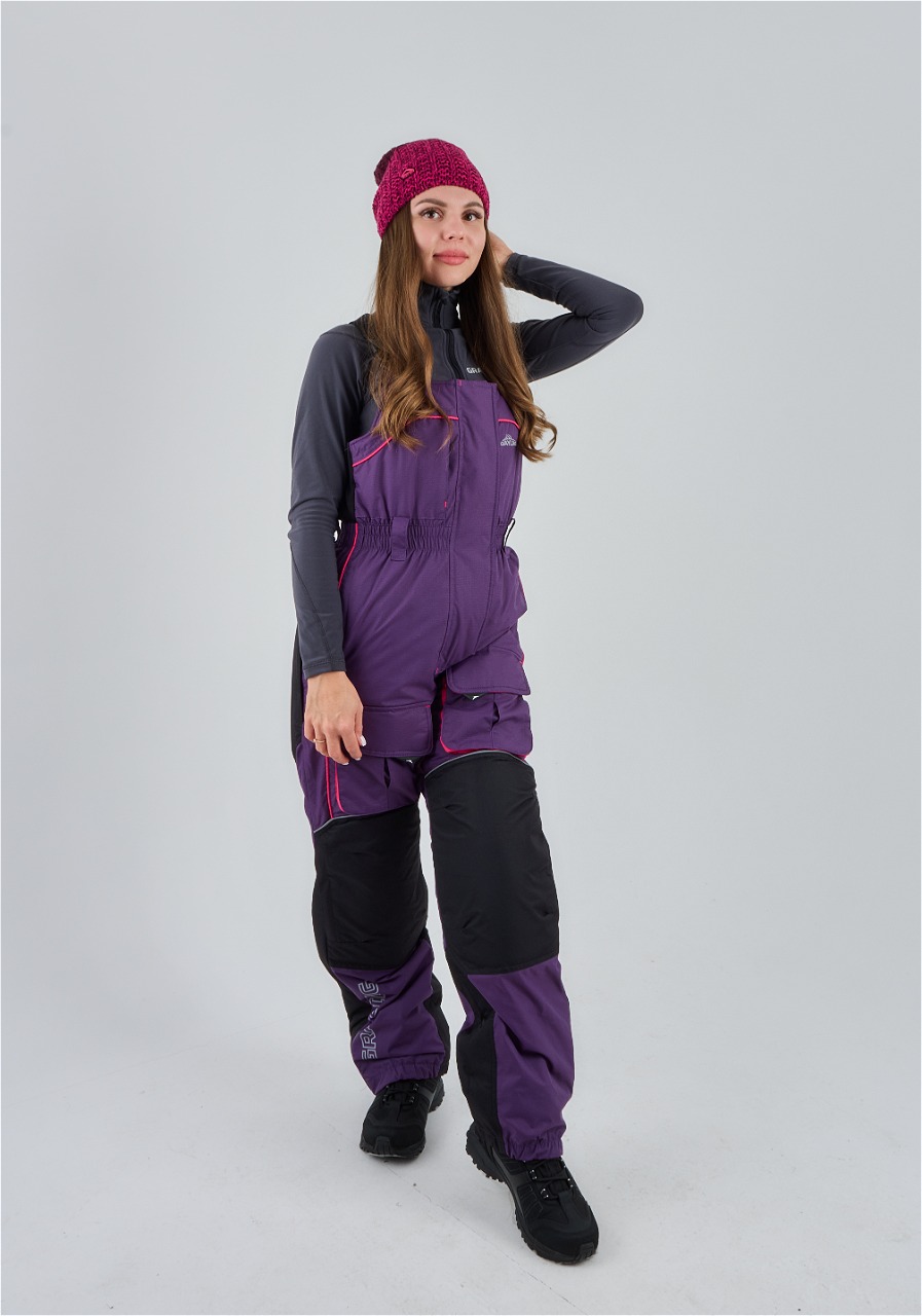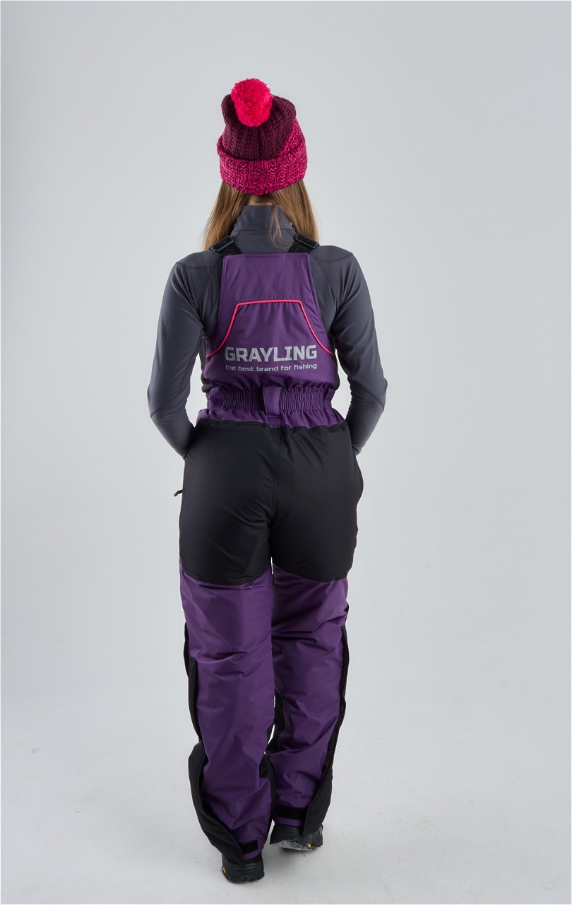 Брюки костюма имеют регулируемые лямки, что обеспечивает комфортабельную посадку и свободу движений. Низ брюк утягивается резинками, что предотвращает их задирание и обеспечивает дополнительную защиту от холодного воздуха и снега.