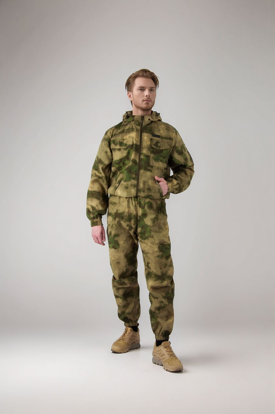 Летний универсальный костюм Пионер из легкой и дышащей ткани - отличный выбор для летней рыбалки, походов, тактических игр. Низ укороченной куртки собран на широкую простроченную резинку. Капюшон регулируется по овалу лица. Два нагрудных кармана закрываются на клапаны с липучками, два нижних кармана с двойными листочками без застежки. Низ брюк и рукавов на резинке.
